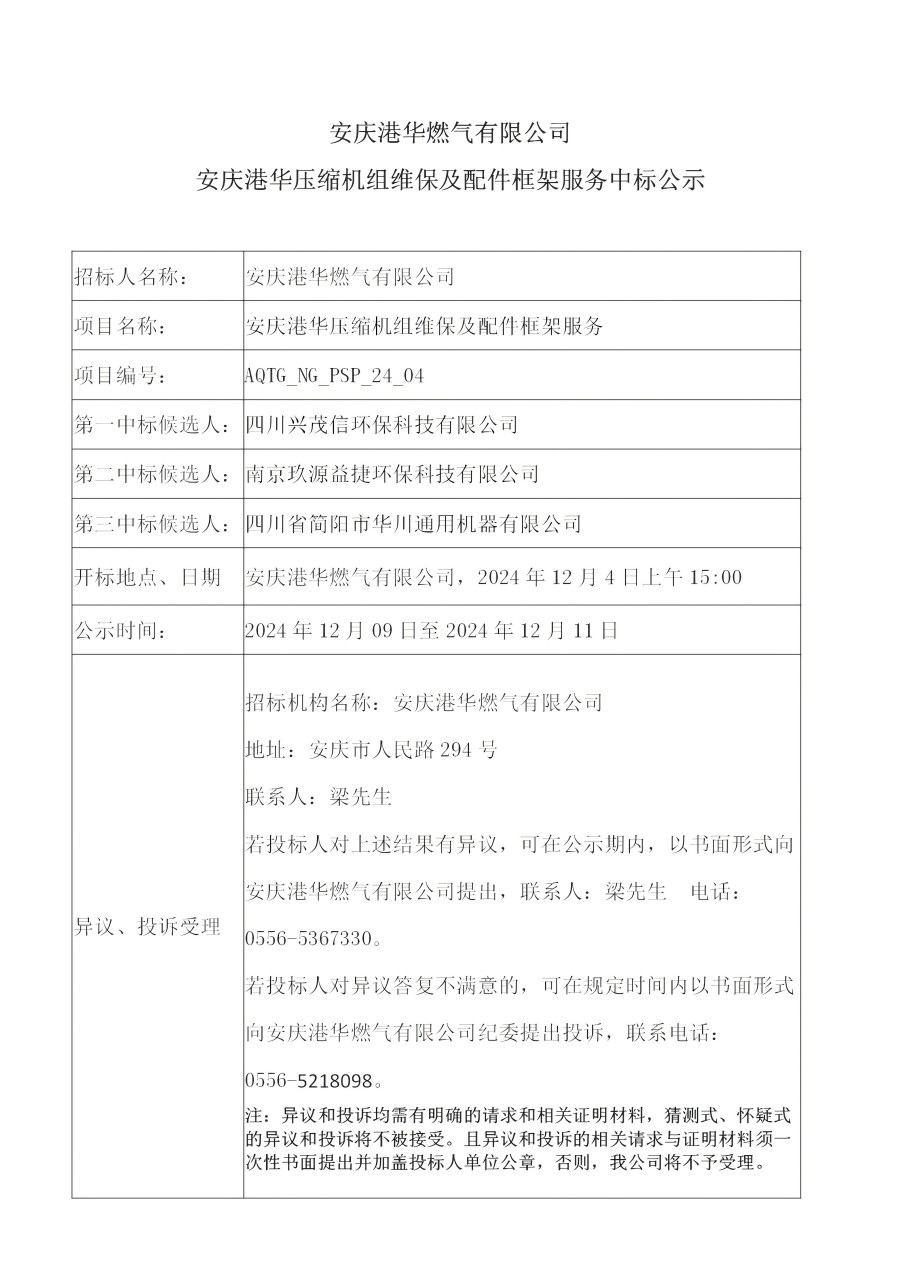 安慶港華燃氣有限公司安慶港華壓縮機組維保及配件框架服務中標公示