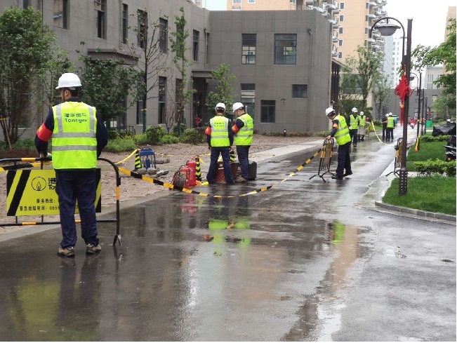當(dāng)天下午15時(shí)30分,公司調(diào)度中心接到報(bào)警:迎江府小區(qū)地下管道遭施工方破壞,造成天然氣泄漏,需緊急處理。接到報(bào)警后,安慶港華維搶人員立即驅(qū)車(chē)趕至現(xiàn)場(chǎng),依據(jù)預(yù)案要求,各就各位地迅速展開(kāi)應(yīng)急搶險(xiǎn)工作:探漏組仔細(xì)檢測(cè)事發(fā)區(qū)域周邊的燃?xì)鈹?shù)值;警戒組對(duì)泄漏點(diǎn)上風(fēng)向30米、下風(fēng)向50米處進(jìn)行警戒,并疏散周邊圍觀群眾及車(chē)輛;搶修組立即確定遭破壞管徑及搶險(xiǎn)物資,并上報(bào)現(xiàn)場(chǎng)情況。
