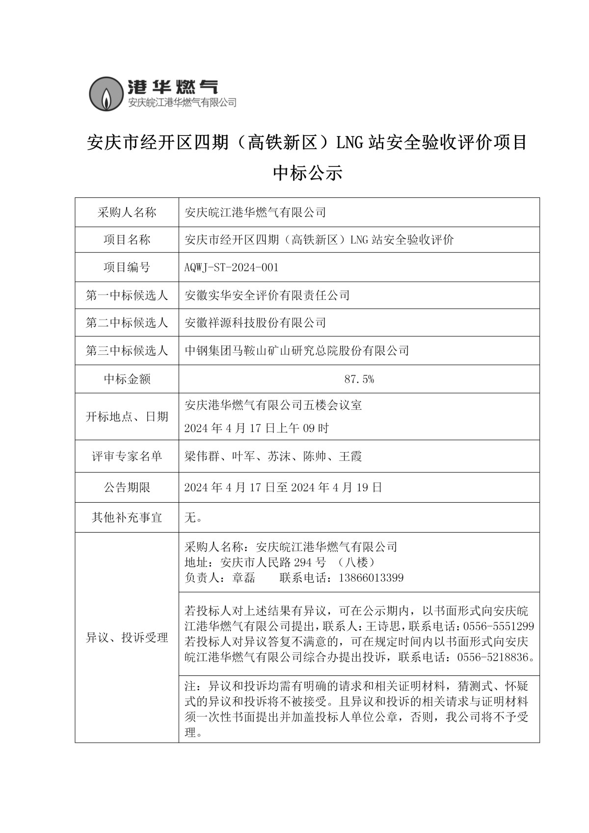 安慶市經(jīng)開區(qū)四期(高鐵新區(qū))LNG站安全驗收評價項目中標(biāo)公示