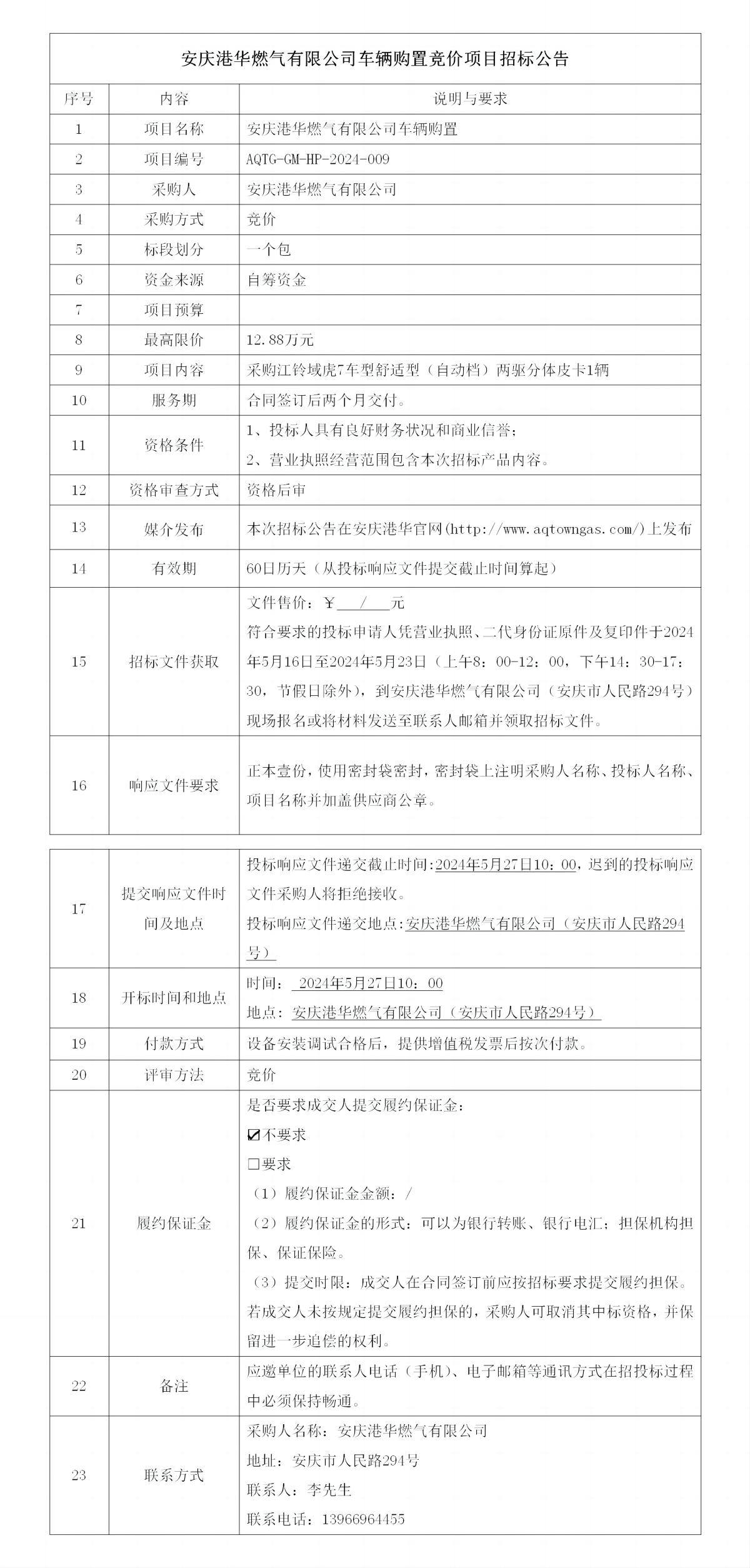 安慶港華燃氣有限公司車輛購置競價項目招標公告