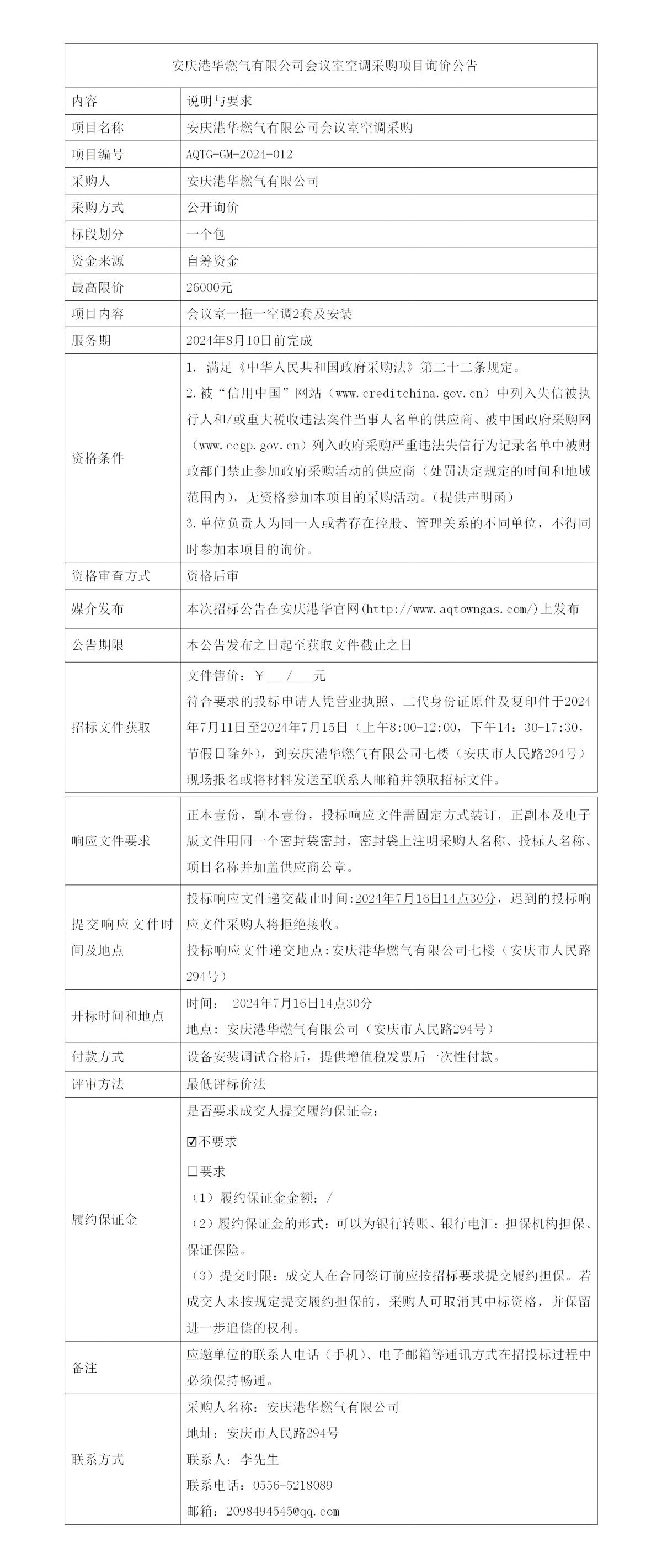 安慶港華燃?xì)庥邢薰緯h室空調(diào)采購項目詢價公告