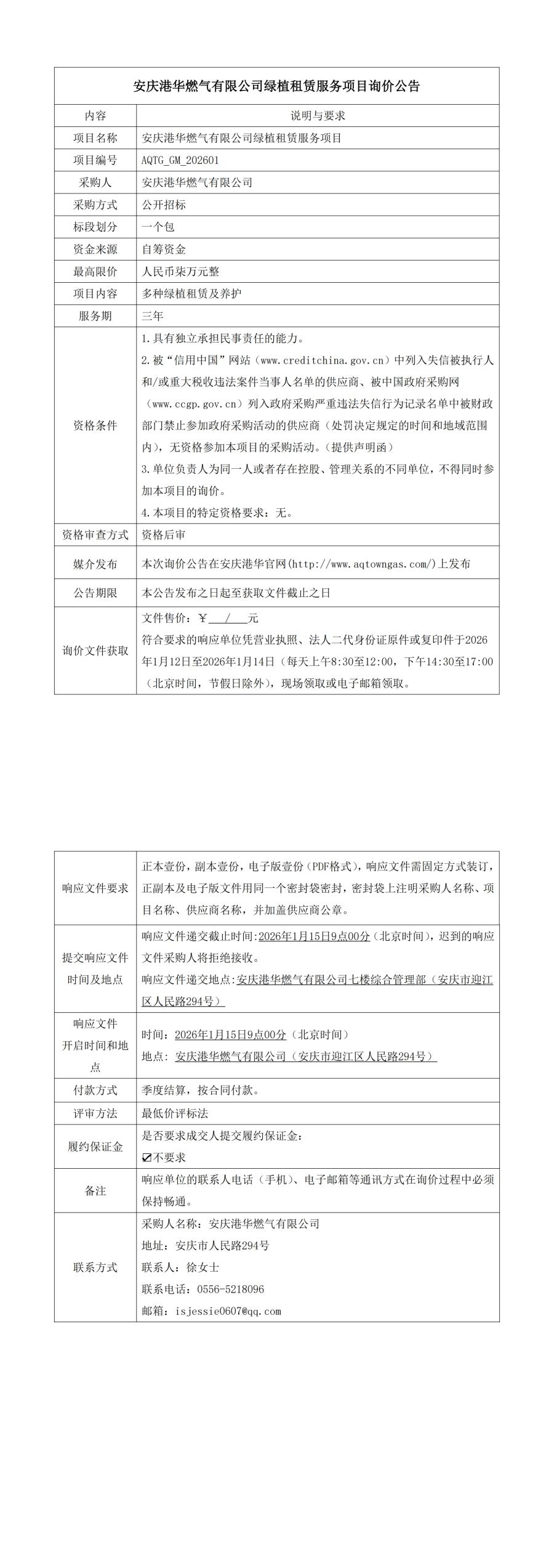 安慶港華燃?xì)庥邢薰揪G植租賃服務(wù)項(xiàng)目詢價(jià)公告